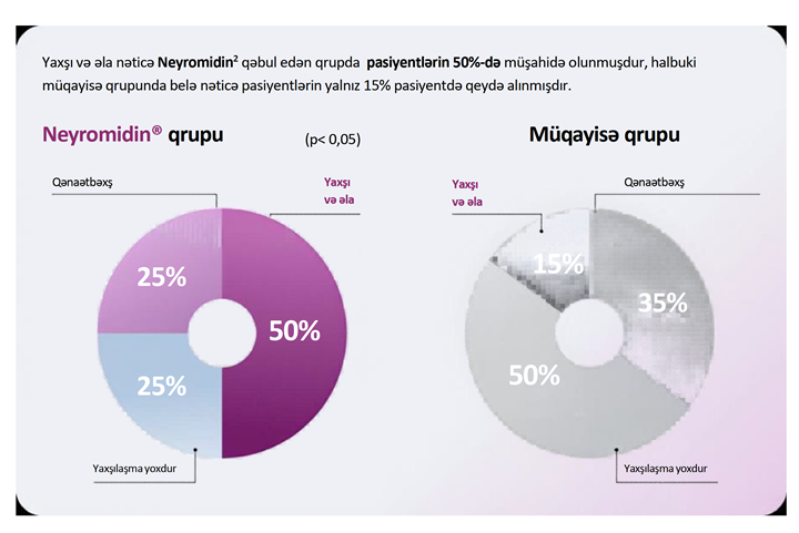 Neyromidin® preparatı ilə müalicə zamanı nevroloji simptomatikanın şiddətinin tədricən azalması müşahidə olunmuş və insultdan sonra 80-ci gündə SİŞ üzrə nevroloji status orta hesabla 22% yaxşılaşmışdır. İnsultun ağırlıq dərəcəsi yüngül səviyyəyə uyğun olmağa başlamışdır.