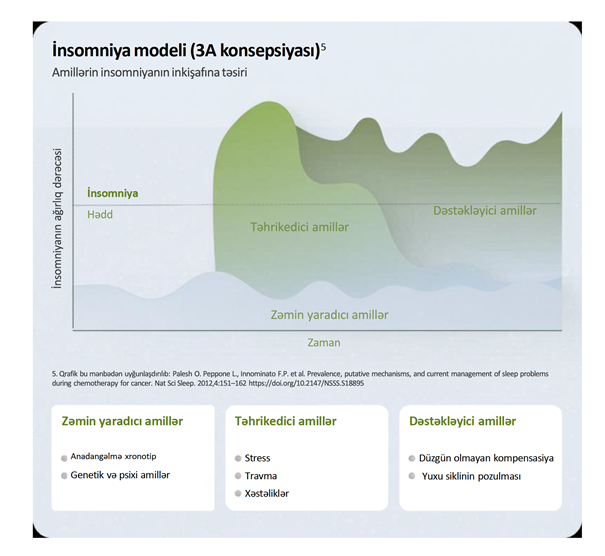 İnsomniyanın inkişaf və xronikiləşmə mexanizmlərini anlamaq üçün üç amil modeli (3A-konsepsiya) geniş istifadə olunur ki, bu da terapevtik təsirin əsas nöqtələrini müəyyən etməyə və pasiyentin aparılması üçün fərdiləşdirilmiş plan işləyib hazırlamağa kömək edir5.