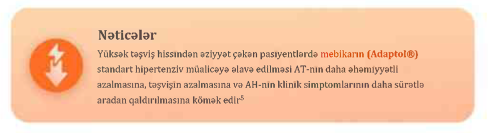 V.N. Kazakovun tədqiqatındastandart hipotenziv müalicə sxeminə sedativ təsirə malik olmayan, koqnitiv funksiyalara təsir etməyən və eyni zamanda emosional vəziyyəti stabilləşdirərək təşvişin şiddətini azaldan anksiolitikin — mebikarın (Adaptol® preparatının təsiredici maddəsi) daxil edilməsi nəzərdən keçirilmişdir3,5.