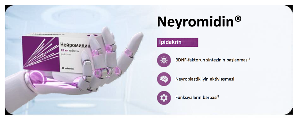 Karotid hövzəsinin işemik insultu olan pasiyentlərin daxil edildiyi randomizə olunmuş tədqiqatda Neyromidin® preparatının standart müalicəyə əlavə edilməsi nəzarət qrupu ilə müqayisədə nevroloji funksiyaların daha nəzərə çarpan dərəcədə bərpasına kömək etmişdir. Preparat yaxşı keçirilmiş, əlavə təsirlər qeydə alınmamışdır9.